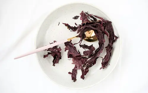 Dulse, a tasty type of seaweed, is sourced from the Atlantic coast of Canada. It is dried and commonly eaten as a flavourful snack or to add delicious seasoning to different dishes.