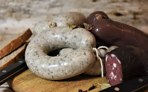 Boudin noir, also known as blood sausage, is a savoury delicacy often found in French-Canadian communities. Made from a combination of pork and pig's blood, it is seasoned with ingredients like onions and herbs to create a tasty sausage. Boudin noir is best enjoyed fried.
