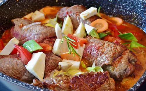 Rouladen, which is popular in German-Canadian areas, is a dish that consists of thinly sliced beef rolled with bacon, pickles, and onions. It's then cooked until it becomes tender. The dish is usually served with a rich sauce and goes well with classic sides such as red cabbage or potatoes.