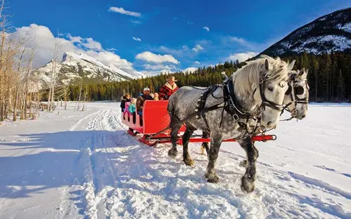 Winter activities: Explore world-renowned resorts in Banff and Jasper for winter walks, or enjoy a journey through snow-clad terrains as you carve your way through pristine snow in a horse-drawn sleigh, complete with sleigh bells for a truly unforgettable experience.
