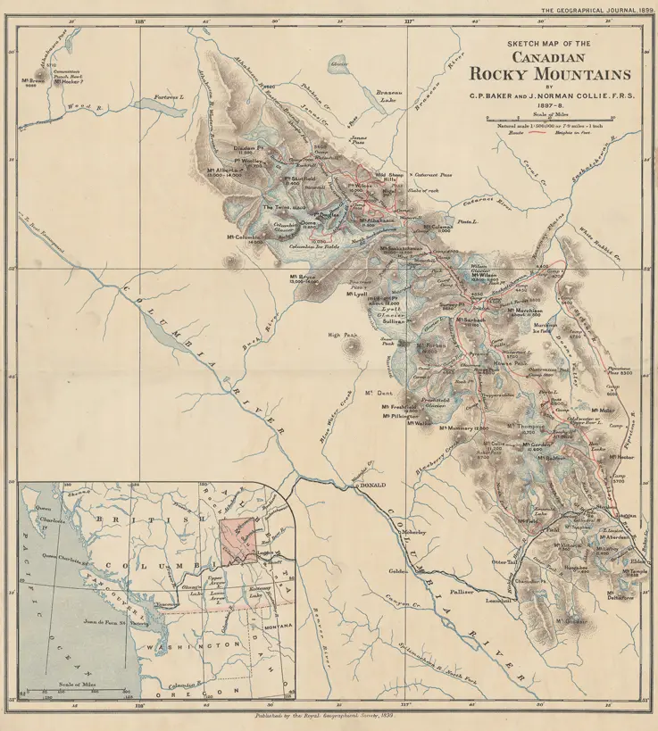 In 1896 he made his first of several visits to the Canadian Rocky Mountains in search of Mount Hooker and Mount Brown, which had reportedly been sighted at a height of 15,000ft. Collie made a total of 21 first ascents, including Mount Victoria which he named after Queen Victoria, and eventually located Mount Hooker and Mount Brown at 9,000ft. Collie also explored the Columbia ice-field, the Bush river and the country between the headwaters of the Saskatchewan and the Columbia rivers.