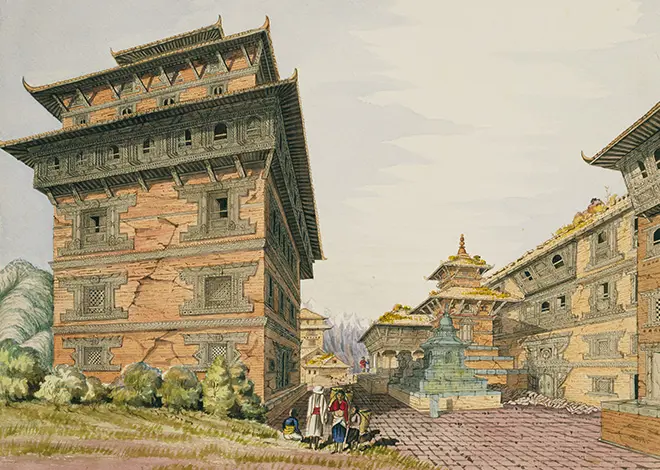 Guided by Hodgson, Chitrakar learned new watercolour and drawing techniques and the use of the camera obscura to apply Western concepts of lighting and perspective, capturing the subject matter in a realistic, lifelike style. His illustrations contributed to many of Hodgson’s research papers and were used as reference material by James Fergusson in his 1876 book ‘History of Indian and Eastern architecture’.