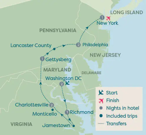 Today you're going to experience 17th Century Virgina, visiting Jamestown Settlement where America’s first permanent English colony was established in 1607. The site demonstrates what daily life was like for the early colonists, the Virginia Indians who lived on the land for centuries, and the first documented arrival of West Central Africans in 1619. Later we’ll move on to Charlottesville, Virginia for a two-night stay.