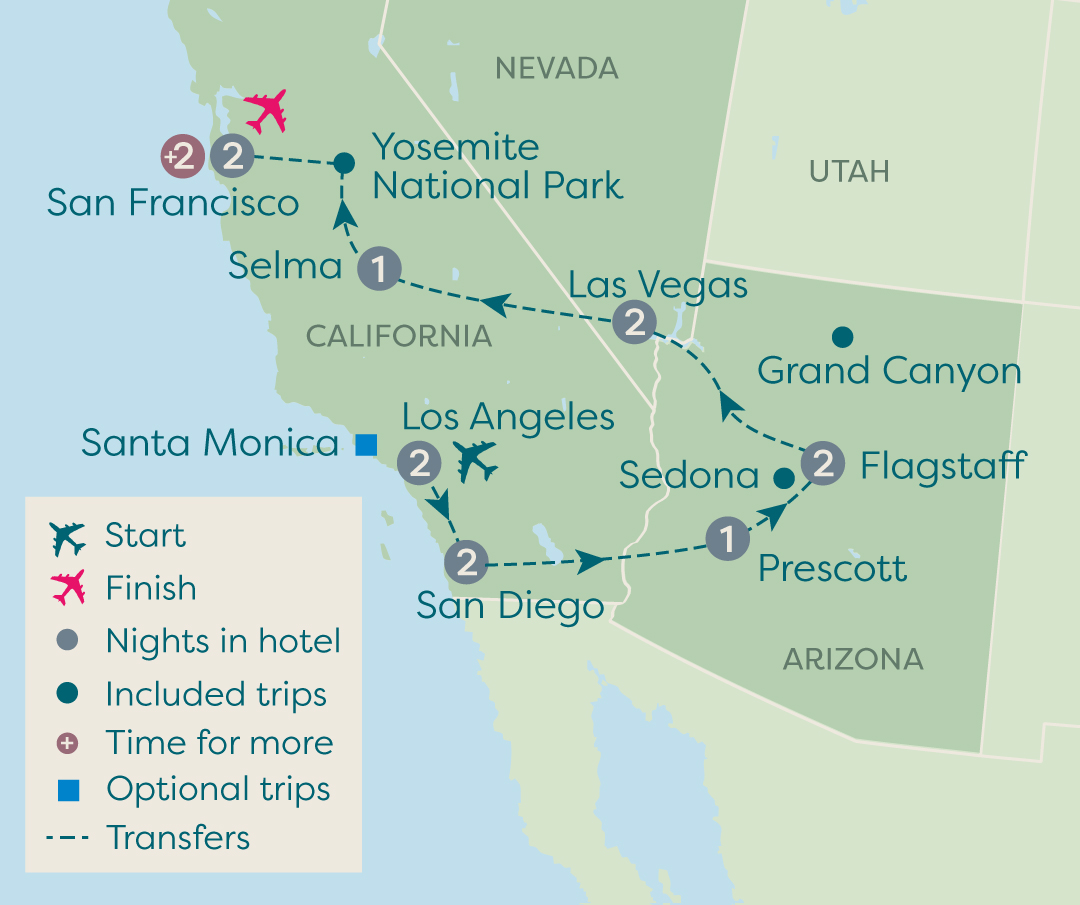 Hollywood, the Grand Canyon, Las Vegas, Yosemite National Park and San Francisco, this tour visits some of America's best-known places! In LA, we'll walk along star studded pavements, before heading through the desert to Arizona. We'll continue to the Grand Canyon, a must-see site, which you could opt to take a helicopter flight over. We'll then travel along the legendary Route 66 to the bright lights of Las Vegas, which looks like a mirage in the desert as the lights begin to appear as you draw closer. Taking in the spectacular natural beauty of Yosemite National Park is next, where you'll have time to explore. Finally, we'll travel across the Golden Gate Bridge and visit the coastal city of San Francisco, where your extended stay allows you a few extra days to make your own discoveries before heading home.