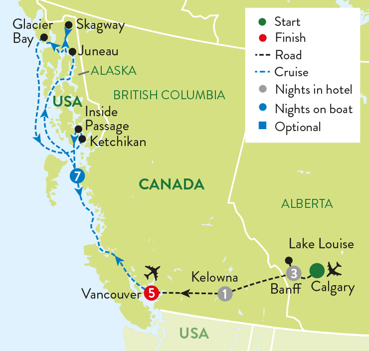 Canada's most spectacular sights are all yours to enjoy as you journey through the Rocky Mountains and embark on a thrilling cruise along the dramatic coastline of Alaska. Your first stop is Banff National Park, where snow-capped peaks, sparkling lakes and wondrous wildlife will stop you in your tracks. Equally breathtaking is Lake Louise – said to be one of the most beautiful places in the whole of Canada. A journey by road through the Rocky Mountains and across British Columbia then takes you to Vancouver. Another splendid beauty, this city is surrounded by water, mountains and forests and always tops the 'best places to live in the world' lists! Now it's time to board the Zaandam, your floating hotel for the next seven nights as you set off on a thrilling Alaskan cruise. As you sail along North America's most scenic coastal landscape, watch for wildlife from the deck – you could spot whales, eagles, seals and grizzly bears. Step ashore in Alaska's capital, Juneau, to view the Mendenhall Glacier, and in Skagway, a lively relic of the Klondike Gold Rush. At Glacier Bay look for huge icebergs floating in the water, before your cruise comes to an end back in Vancouver for an extended stay.