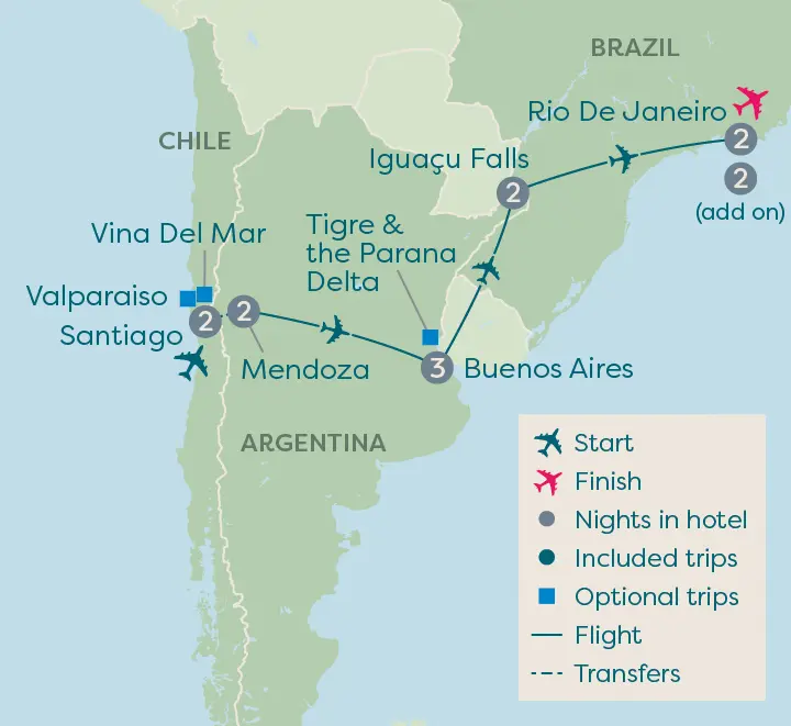 This incredible tour gives you the chance to explore breath-taking sights in three fascinating South American countries. Enjoy extended time in the fascinating city of Rio de Janeiro at the end of your holiday.