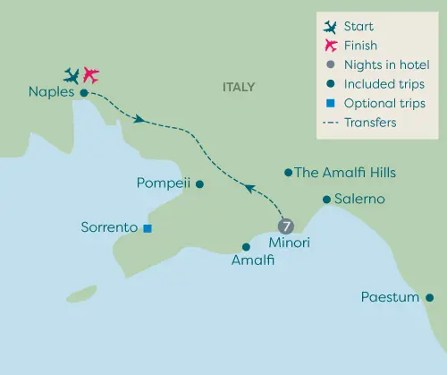 On this fabulous holiday you'll stay in the village of Minori and spend a week exploring the delights of the Amalfi Coast. First, you'll discover the picturesque towns of Amalfi and Ravello, which overlook the azure waters of the Mediterranean Sea. We also visit the fantastic archaeologic site of Paestum with the well-preserved Greek temples. There's an opportunity to learn how the area's famous liqueur limoncello is made, followed of course by a tasting in Sorrento. Next, you'll admire picture-postcard scenery as you drive to a winery in the Amalfi Hills and try some locally produced wines alongside a lunch of cheese and salami. You'll discover the exceptional archaeological site of Pompeii, the Roman town frozen in time by the eruption of Mount Vesuvius.