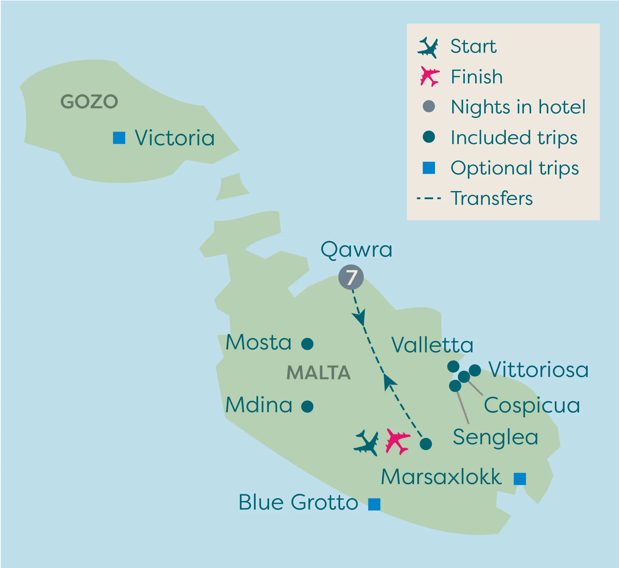 Get to know sunny Malta on this relaxing tour, which encompasses food, culture, heritage and the island's dazzling coastline. Wander the narrow streets of the capital Valletta, visit Barrakka Gardens and witness the saluting battery, and get a taste of delicious rustic cuisine. Tour fascinating medieval sites and shop for artisanal handicrafts, all while enjoying plenty of free time unwinding with good food, wine and views of the sparkling Mediterranean. You can also take in even more of the island's natural beauty on optional day trips to the Blue Grotto sea caves and the unspoilt island of Gozo.