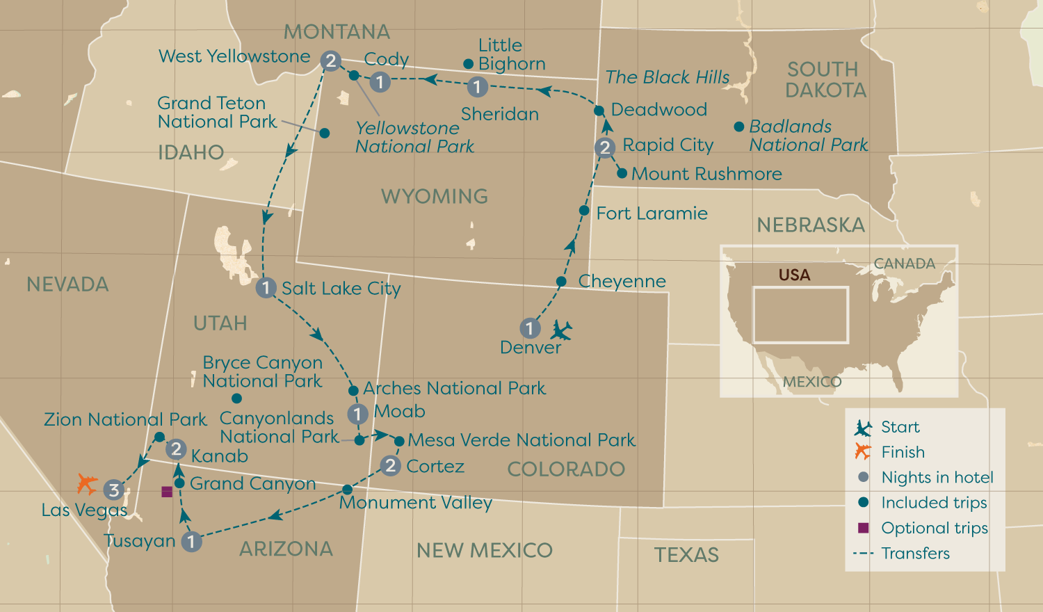 Your adventure starts in Denver, Colorado and takes you through seven different states to the bright lights of Las Vegas. Throughout your journey, you will discover stunning historic sites and landmarks dedicated to those who defined the country’s history and step into the world of the ‘Wild West’.