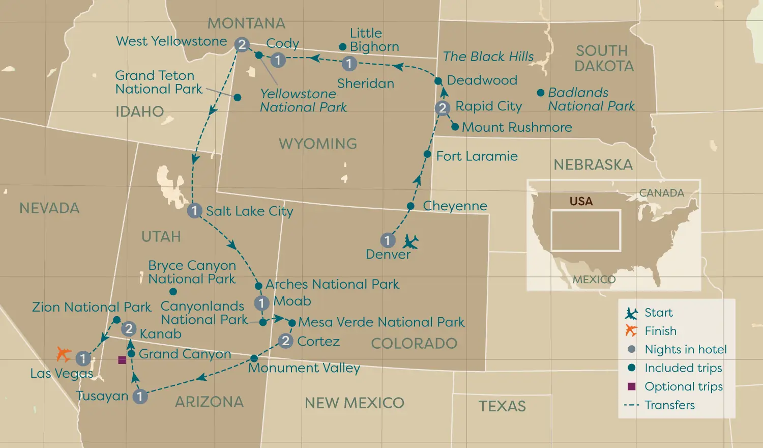Your adventure starts in Denver, Colorado and takes you through seven different states to the bright lights of Las Vegas. Throughout your journey, you will discover stunning historic sites and landmarks dedicated to those who defined the country’s history and step into the world of the ‘Wild West’.