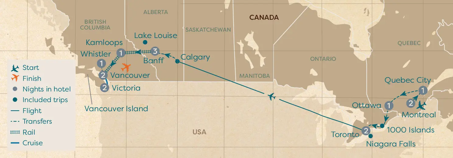 Journey from East to West taking in the best of Canada, plus a ride on the iconic Rocky Mountaineer train topped of with a relaxing stay in Vancouver.