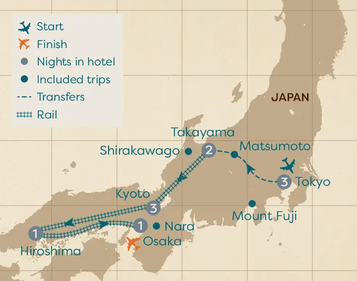 There are few places on Earth where the contrast between traditional and modern is quite so marked as in Japan and on this holiday you'll discover many of its incredible highlights. Beginning in dazzling Tokyo, you'll go on to admire incredible views of Mount Fuji, see the beautiful Matsumoto Castle and visit the traditional city of Takayama. After riding the famous Bullet Train to Kyoto, you'll spend three nights exploring this charming city before heading to Hiroshima and uncovering its poignant history. Your journey ends in bustling Osaka, where you'll visit Osaka Castle and have some free time for shopping if you wish.