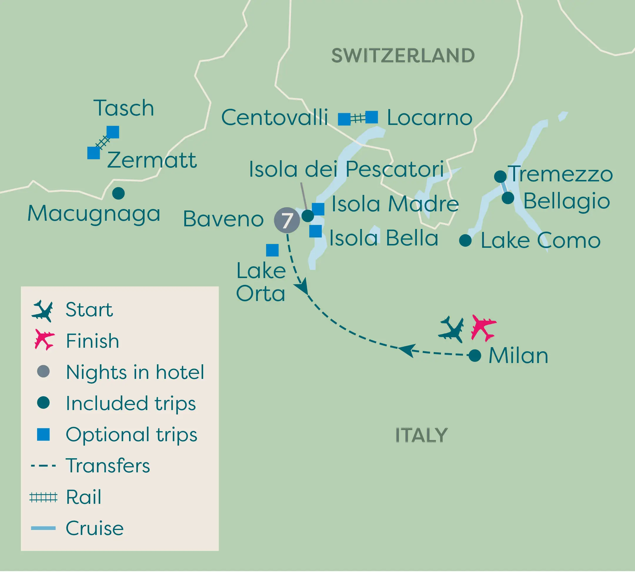You’ll stay in a comfortable hotel on the shores of Lake Maggiore and enjoy a day trip to Lake Como and the elegant town of Bellagio. There’s a chance to admire the rugged peaks of the Alps when you visit a pretty mountain resort and time to savour the moment as you cruise to a tiny island for dinner.