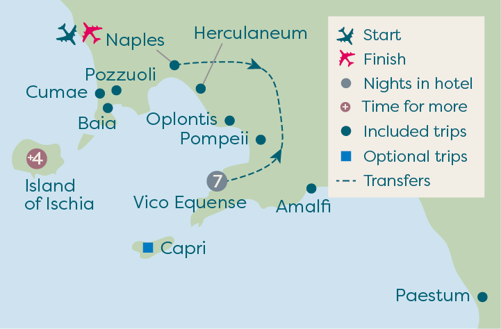 Today is the day that you will explore the remarkable ruins of Pompeii. As you wander its streets, you'll understand what life was like here before Mount Vesuvius erupted in 79 AD smothering it and its inhabitants in hot ash. You’ll travel to Pompeii by train and meet a Local Guide who will help you uncover the secrets of many of the city’s best sights. These include villas decorated with frescoes, colourful mosaics, Roman baths, an impressive amphitheatre and more. You will have your own return train ticket, so after the tour, you can either travel back to the hotel with your Holiday Director or have time to yourself at this fascinating site.