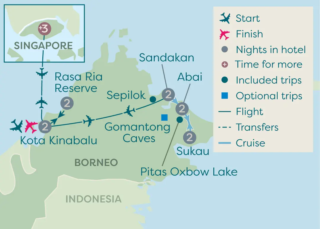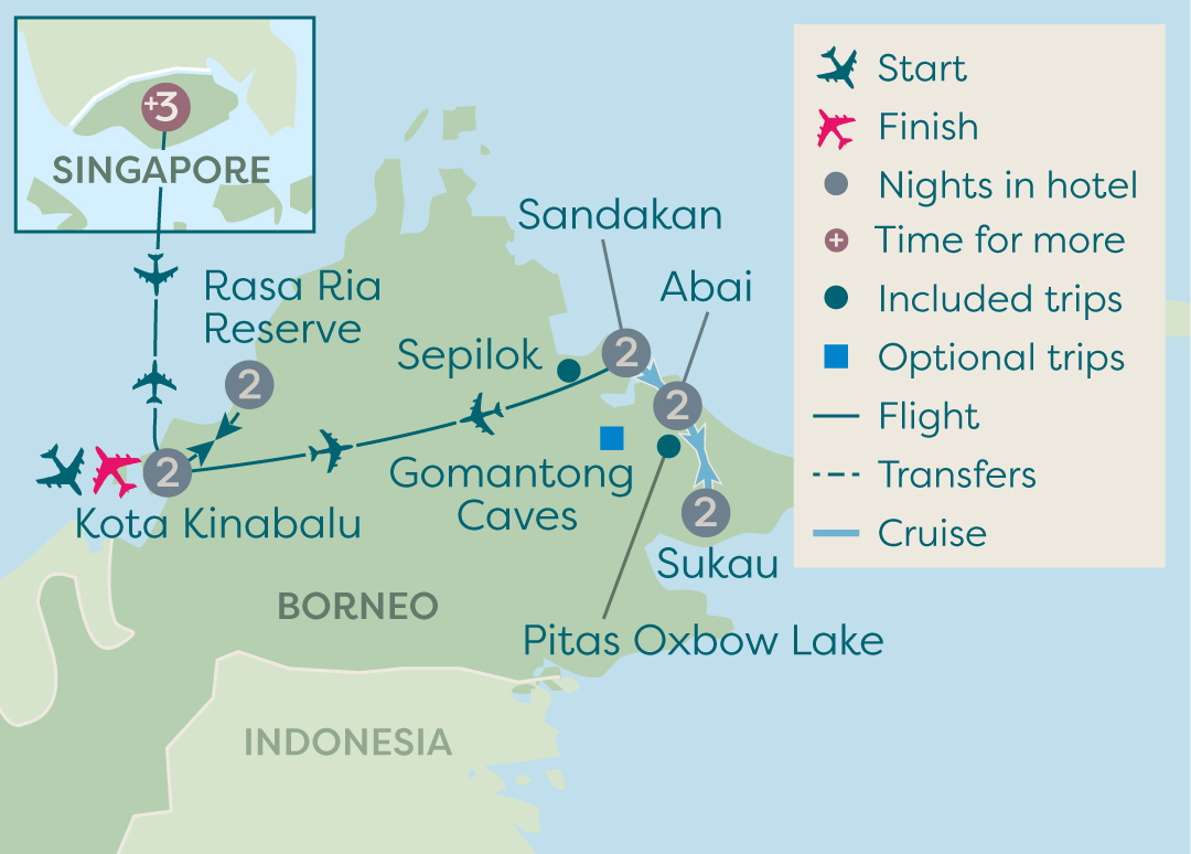 Head into the jungle and rainforests of Borneo for the chance to spot orangutans and pygmy elephants in the wild. Before heading homewards spend three nights in Singapore for a city break.