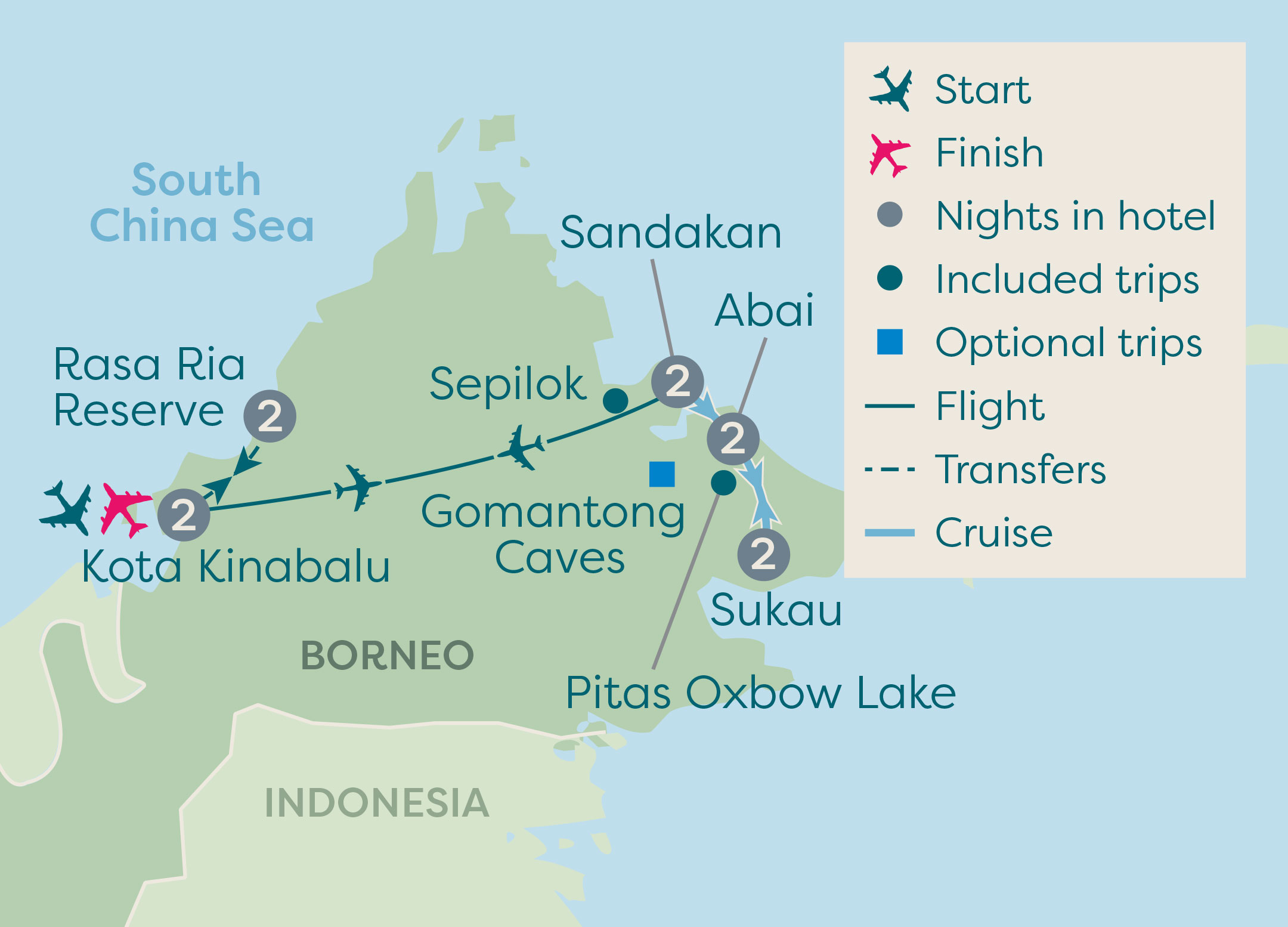 This unforgettable adventure takes you through the heart of Borneo. You’ll begin your adventure in Kota Kinabalu, where you’ll enjoy local cuisine, experience Sabah's rich culture and venture into the lush countryside to learn more about rural life. Your wildlife encounters truly begin in Sepilok, where you'll witness the orangutans and sun bears. Enjoy a cruise along the Kinabatangan River – keep your eyes peeled for the diverse wildlife here, from proboscis monkeys to pygmy elephants. Explore the mysterious Gomantong Cave and unwind in the luxurious Rasa Ria Nature Reserve, where the rainforest meets the sea. This carefully-crafted itinerary offers the perfect balance of wildlife, cultural immersion, and relaxation, introducing you to the very best of Borneo.
