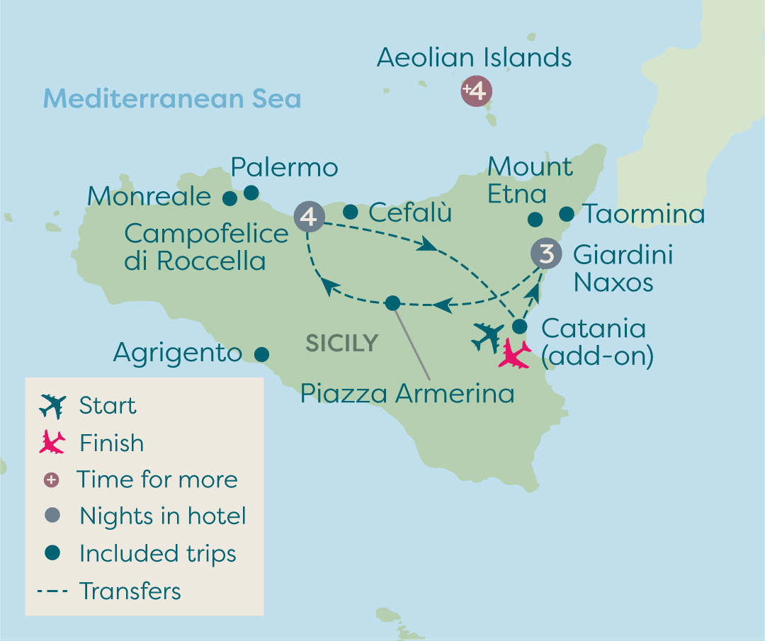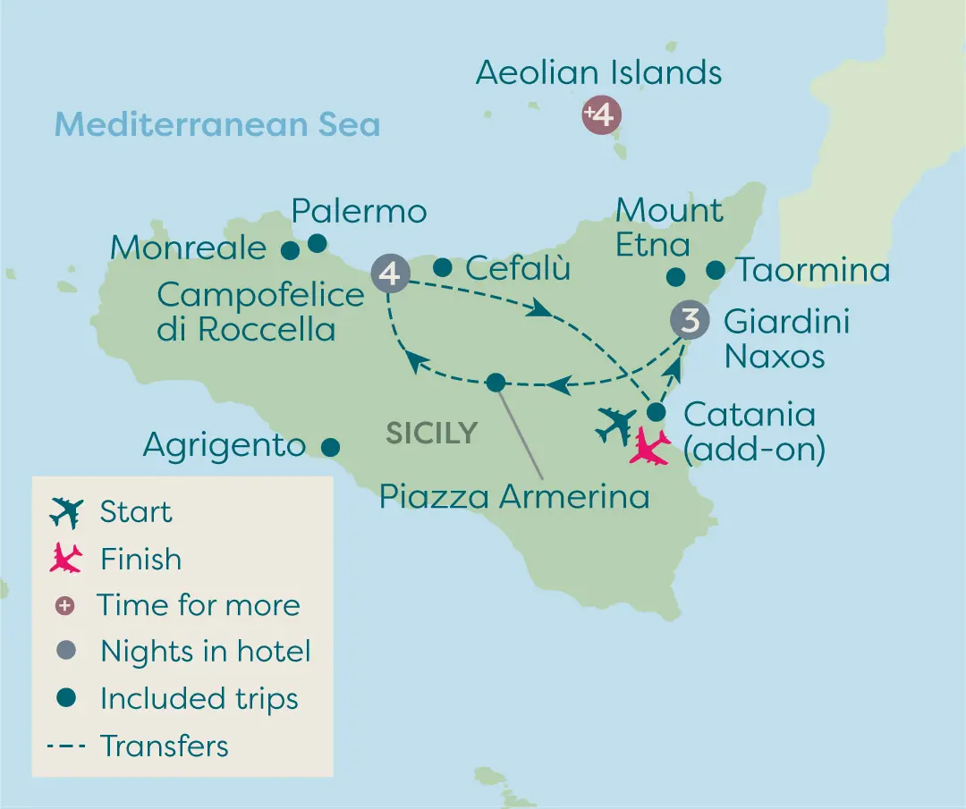 On this extended version of Best of Sicily tour you will spend eight days in delightful Sicily followed by a leisurely four days on the UNESCO-protected Aeolian Island of Lipari. You'll get the chance to explore Taormina, marvel at the brooding Mount Etna, visit the the 4th century Villa Romana del Casale and then onto Palermo and its beautiful Monreale Cathedral. For the remaining four days you will be staying on Lipari, largest of the Aeolian Islands famed for its beauty, tranquil atmosphere and the unique flavours of its food and wine, followed by a final night in the city of Catania back on Sicily.