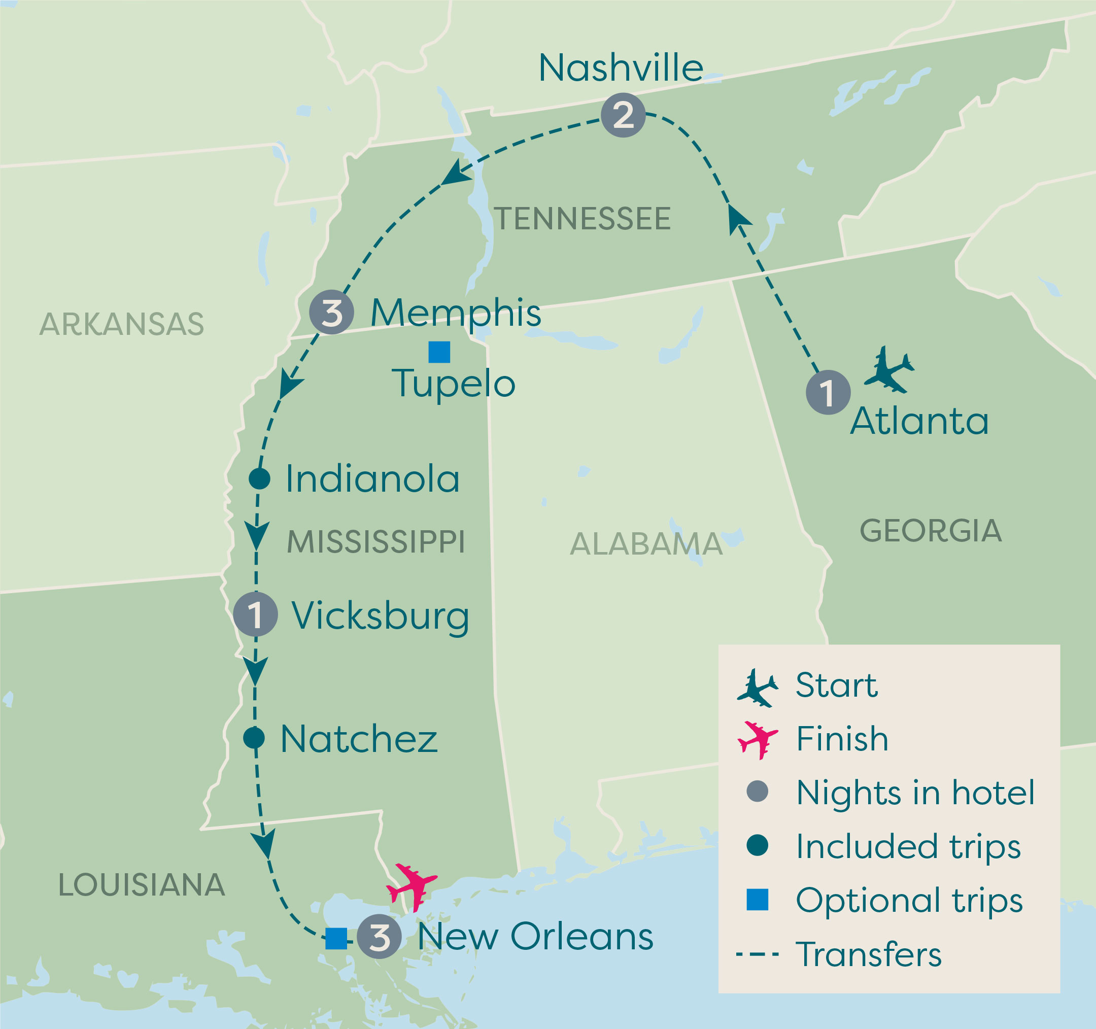 As well as exploring the Deep South’s musical roots, this carefully crafted holiday also includes opportunities to learn about the Civil Rights Movement, and the chance to visit an elegant antebellum mansion. We’ve arranged city tours to help you tick off all the must-see sights and leave you to decide how you spend your free time. You can join an optional excursion if you wish or head out and do your own thing. Take a stroll through the park, visit a late-night jazz club or tuck into a bowl of gumbo – the choice is all yours!
