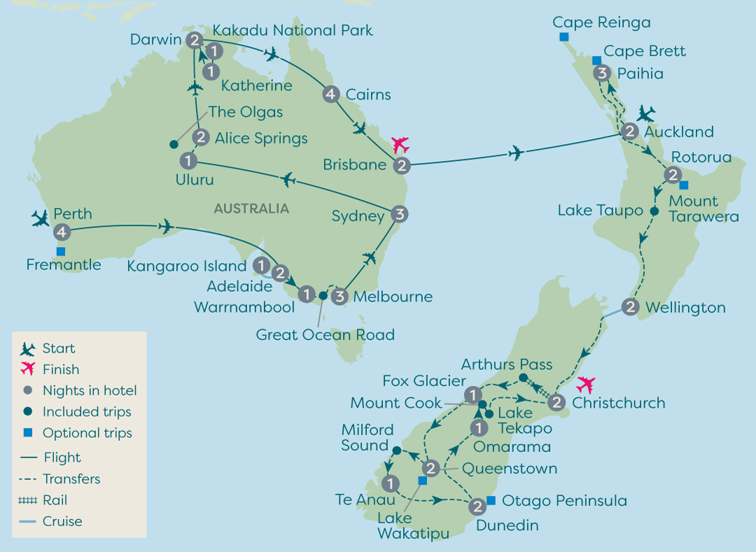 This all-encompassing tour of Australia introduces you to so many of the highlights of this thrilling destination. Explore beautiful Perth and uncover the nature-lovers' paradise of Kangaroo Island, to see kangaroos, koalas and wallabies. Take a scenic journey along the Great Ocean Road, opt to visit Phillip Island to watch the delightful penguin parade, then take in Sydney's spectacular sights. Next, you'll see Uluru at sunset and sunrise, as well as the mysterious Olgas. Continue your adventure in Alice Springs, famous for its Flying Doctor Base and the School of the Air, before heading to Kakadu National Park. Here, you'll head off on a cruise in search of crocodiles and get to admire fascinating Aboriginal rock art. Cairns in Queensland, is your gateway to the amazing Great Barrier Reef. Spend lazy days soaking up the sun or discover even more on a range of optional excursions.
