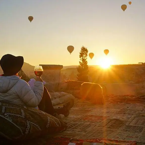 Enjoy a glass of wine and expansive views while watching the sunset over the extraordinary rock formations and fairy-tale scenes of Cappadocia’s Love Valley.