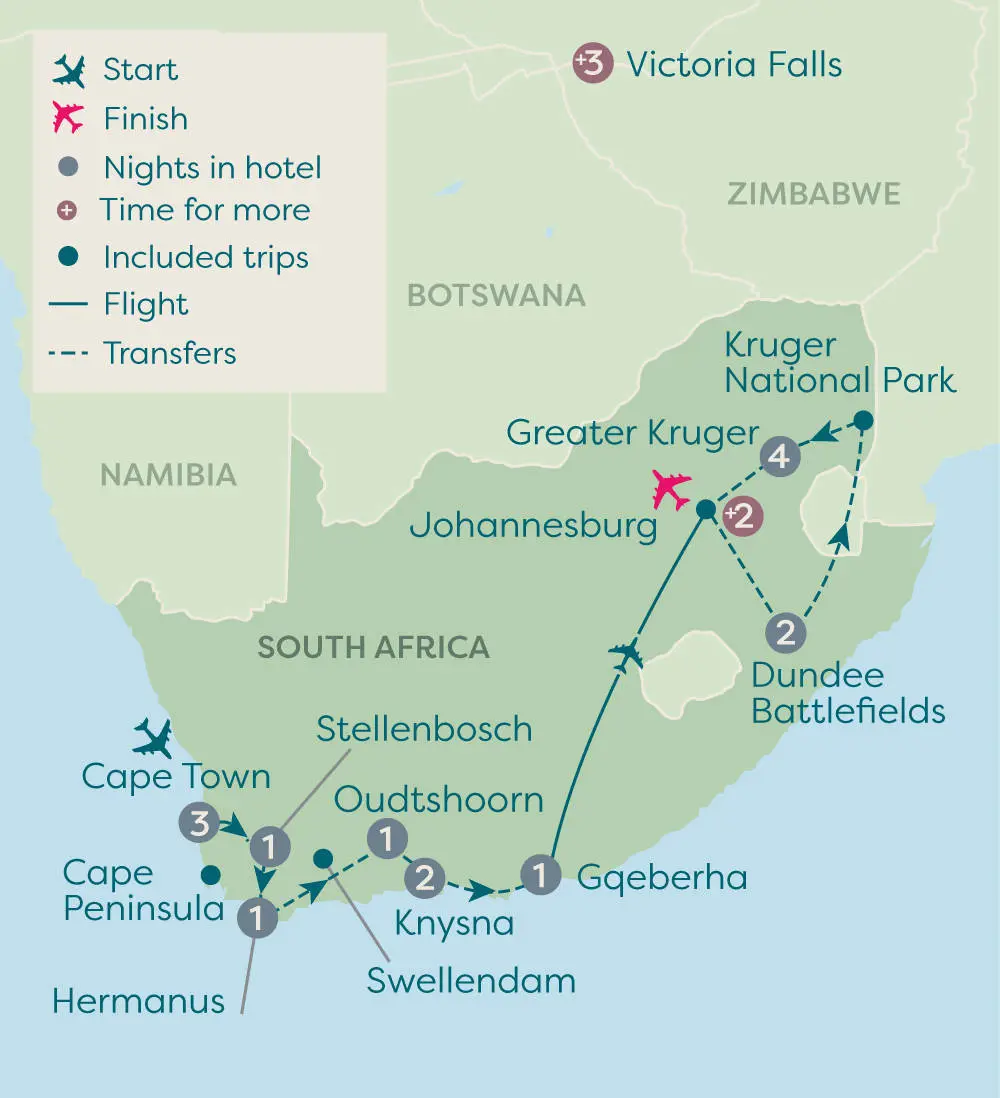 Discover the very best of South Africa on this all-encompassing tour. Beginning in Cape Town, take the cable car up Table Mountain and enjoy a tour of the Cape Peninsula which includes a visit to Cape Point and Boulders Beach. Next, you'll head to Stellenbosch in the Western Cape winelands, before heading to Hermanus for an incredible whale-watching experience. Continuing to Knysna, a town at the heart of the famous Garden Route. From Port Elizabeth we'll go on to discover the KwaZulu-Natal battlefields on a tour. Kruger National Park is our next destination, where we'll head out in search of the Big Five, before a drive along the scenic Panorama Route. Complete this incredible adventure with a visit to awesome Victoria Falls where you'll enjoy a fabulous Boma Dinner & Drum show, a guided tour of the Victoria Falls and a sunset cruise along the Zambezi River.