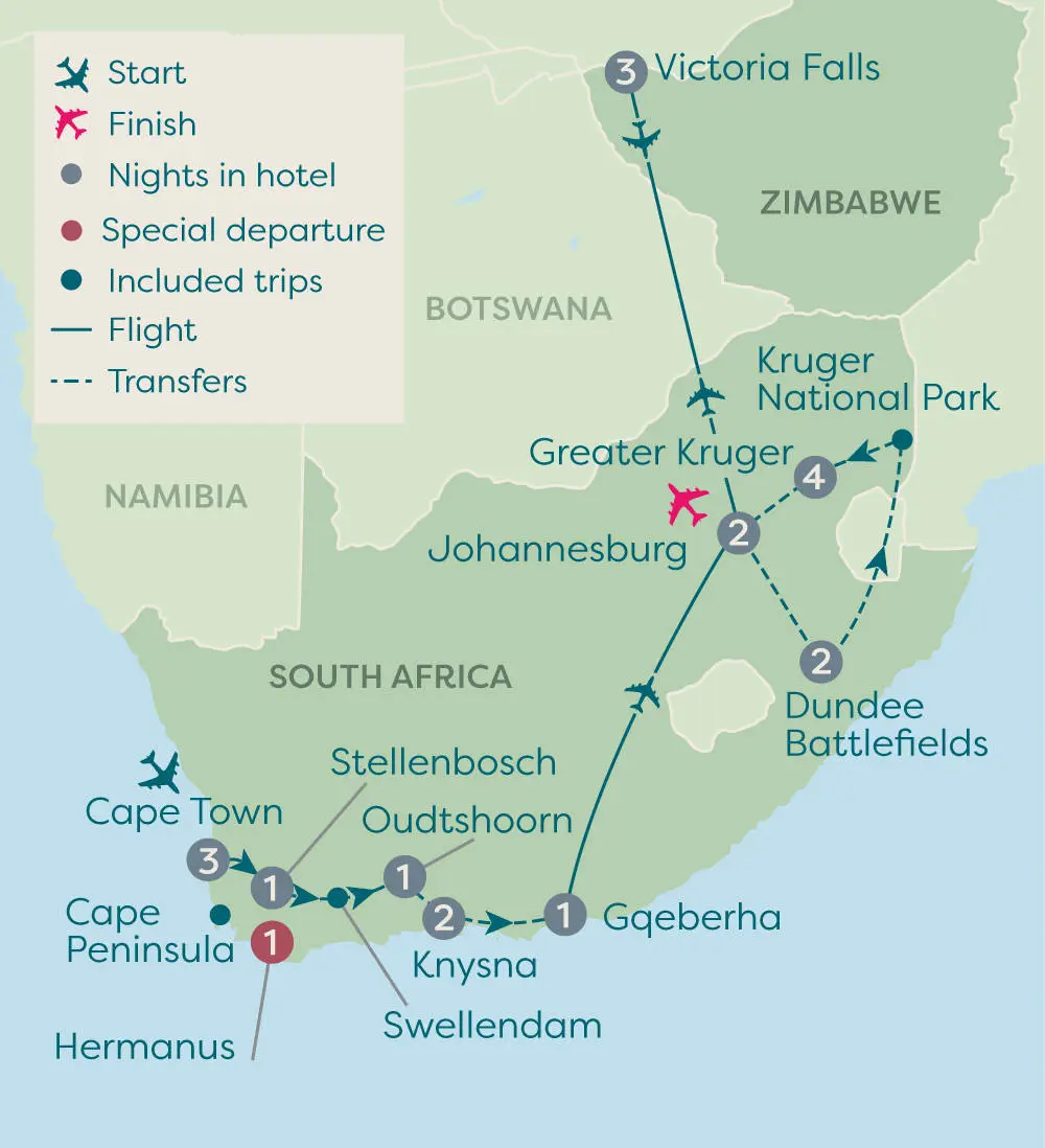 Discover the very best of South Africa on this all-encompassing tour. Beginning in Cape Town, take the cable car up Table Mountain and enjoy a tour of the Cape Peninsula which includes a visit to Cape Point and Boulders Beach. Next you'll head to Stellenbosch in the Western Cape winelands, before continuing to Knysna, a town at the heart of the famous Garden Route. From Gqeberha we'll go on to discover the KwaZulu-Natal battlefields on a tour. Kruger National Park is our next destination, where we'll head out in search of the Big Five, before a drive along the scenic Panorama Route. Complete this incredible adventure with a visit to awesome Victoria Falls where you'll enjoy a fabulous Boma Dinner & Drum show, a guided tour of the Victoria Falls and a sunset cruise along the Zambezi River.